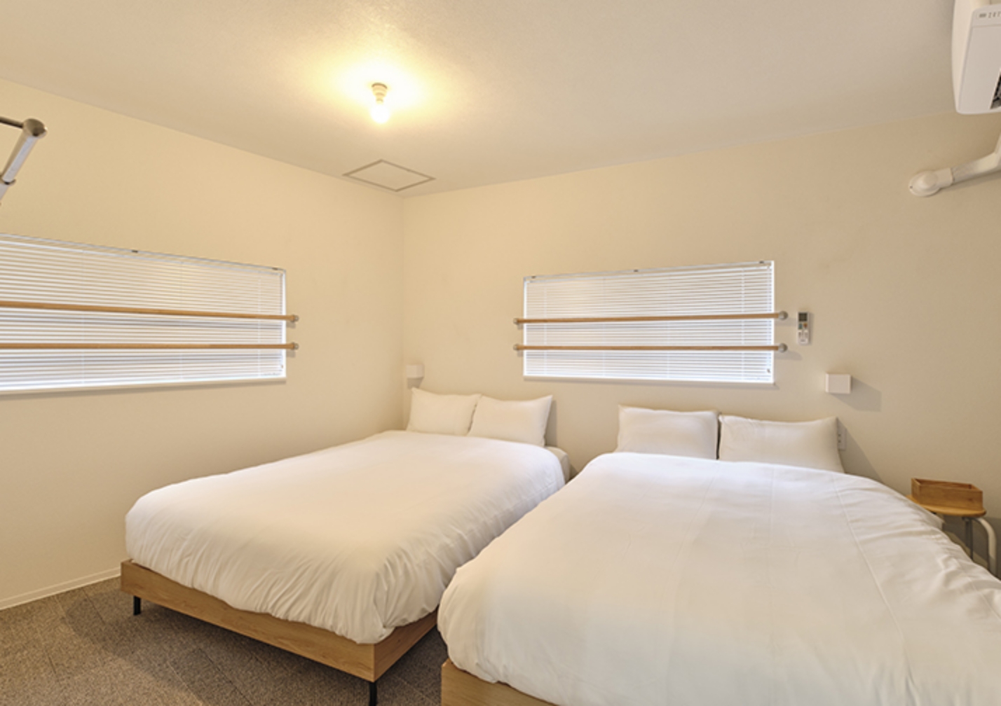 白を基調とした落ち着いた空間に、穏やかな光が差し込みます。 かつての住宅を改装した45.8㎡の1DKには、ダブルベッドを2台と大型テーブルを備えており、仕事や食事、語らいなど多目的にご利用いただけます。無料Wi-Fiと洗濯乾燥機を完備し、長期滞在にも快適です