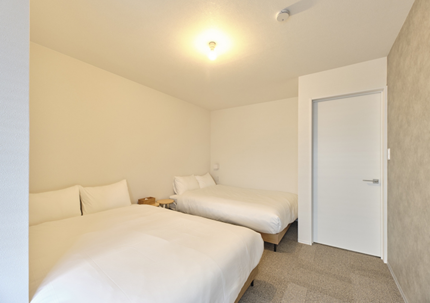 白を基調とした70㎡の広々とした2LDKタイプ。ダブルベッドを備えた2つの個室と、大きなテーブルを配したリビングスペースを完備しています。 最大8名まで宿泊可能で、ファミリーや二世帯旅行、グループ滞在にも最適です。無料Wi-Fi環境下でのPC作業やWEB会議にも対応し、ワーケーションにもおすすめです。 シャワー室2室と洗面台2台を備え、複数名での滞在も快適にお過ごしいただけます。